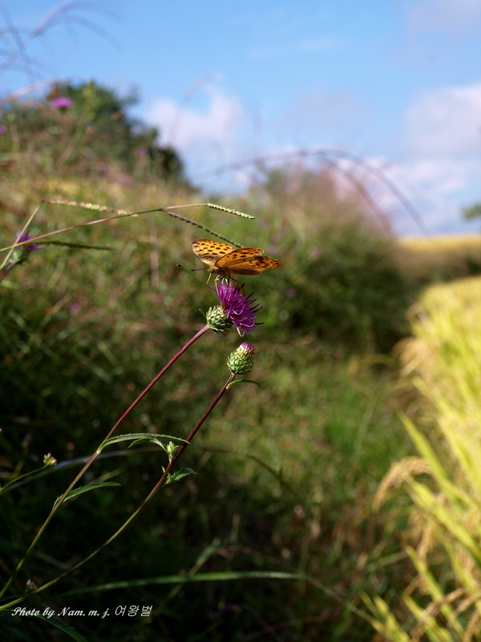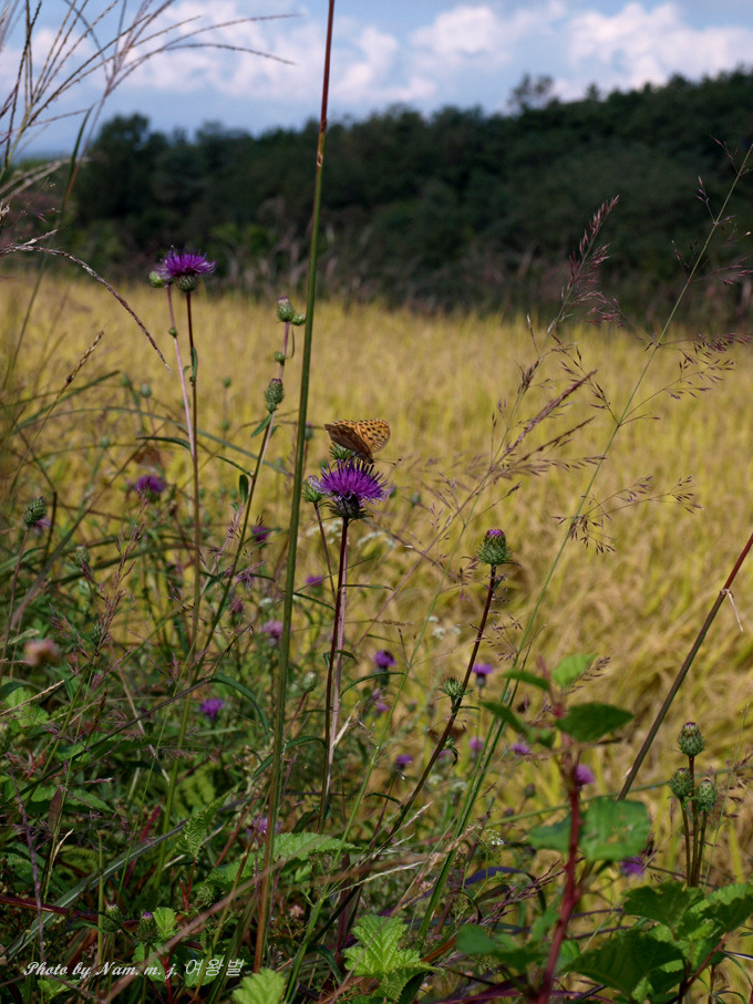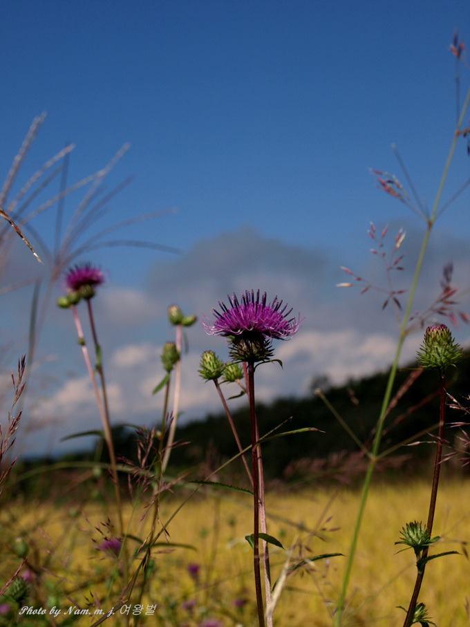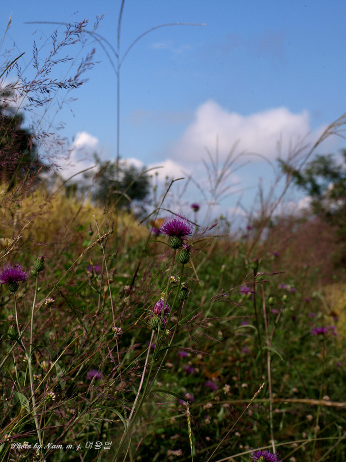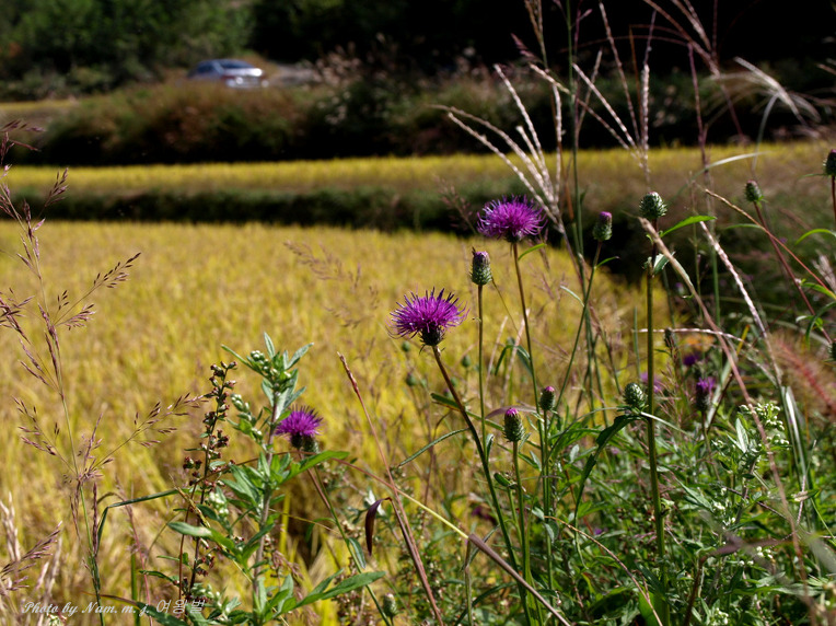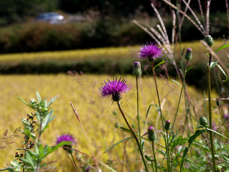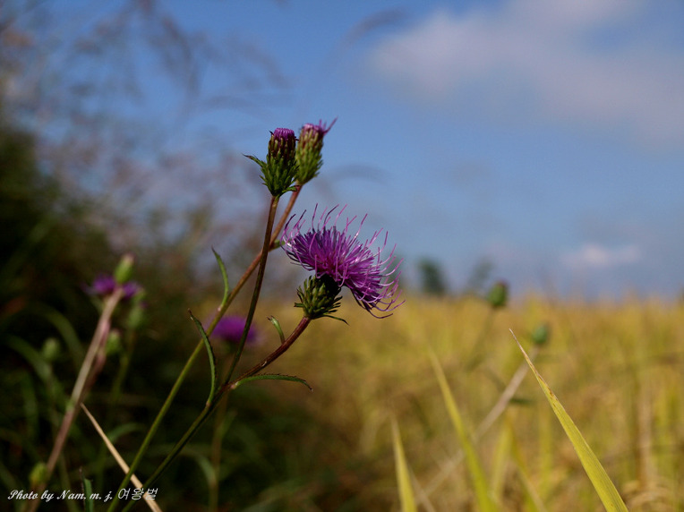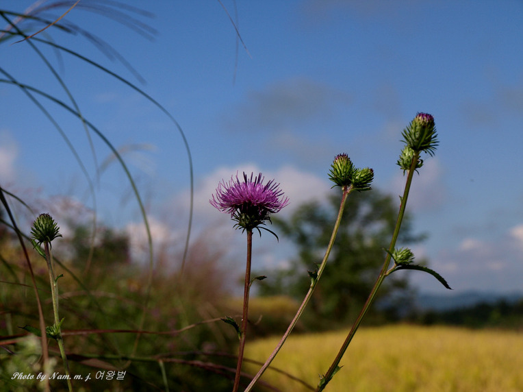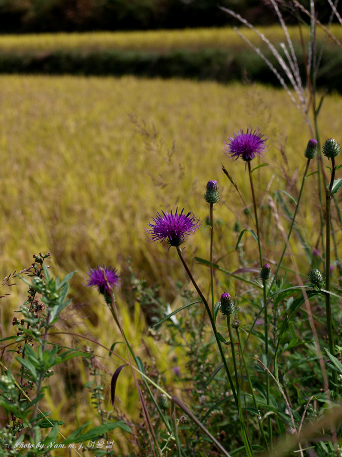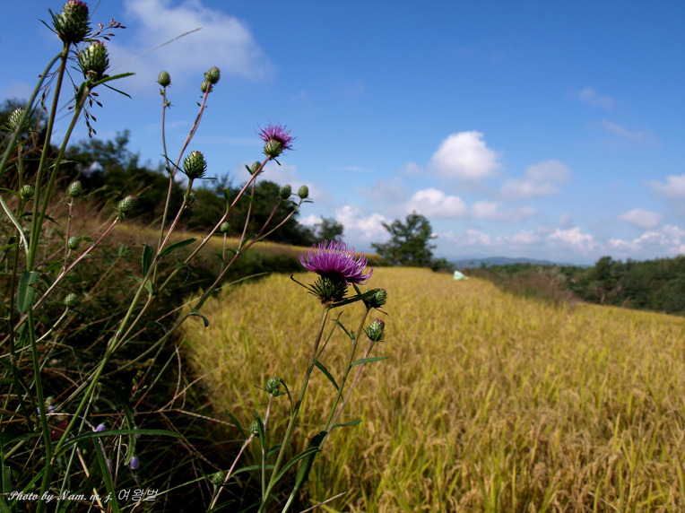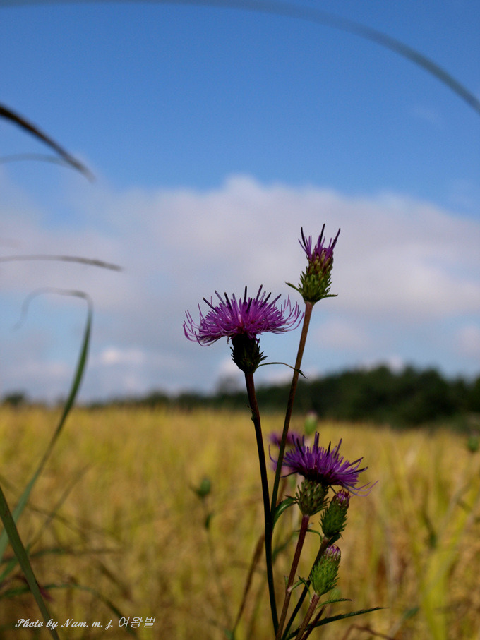 예상대로 동래엉겅퀴가 보라색 곱게 꽃을 피웠다. 하늘은 파랗고 흰구름도 떠 있고 눈자락 노랗게 벼가 익고 있는데