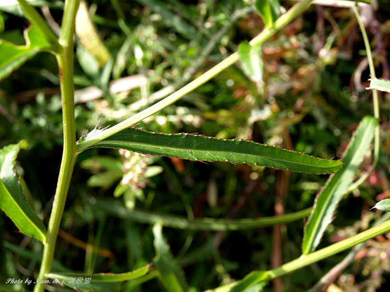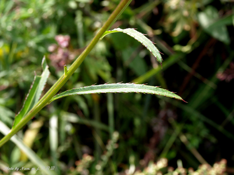 밑부분의 잎은 긴 타원형이고 양끝이 좁으며 가시가 있고 밑으로 흐르지 않으며 길이 14-17㎝, 나비는 4-6㎝로서