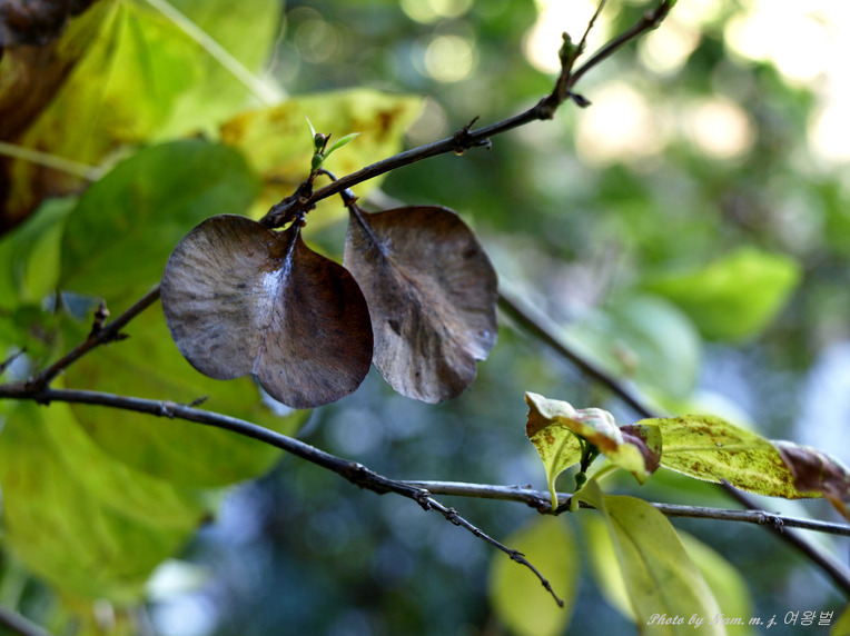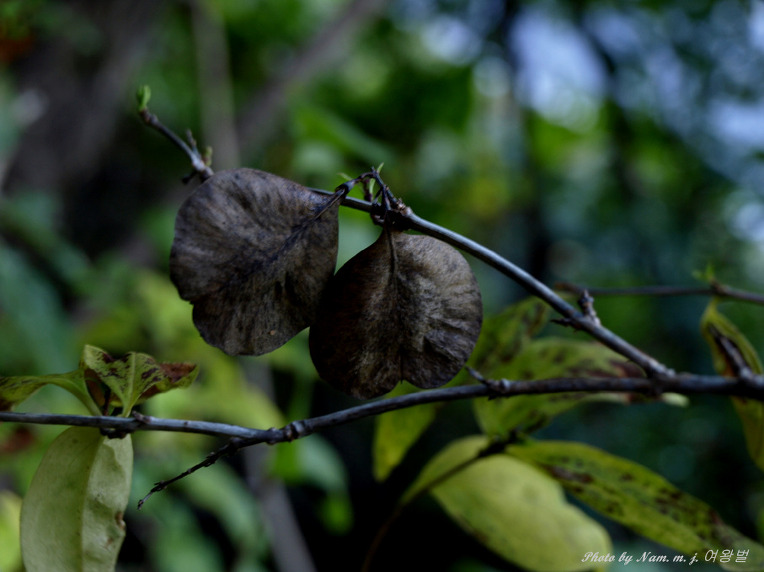 이른 봄 잎도 없이 미색의 개나리같은 꽃을 피던 녀석이 부채 같은 열매를 달았다.