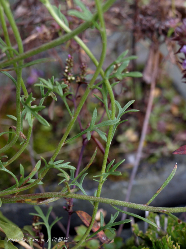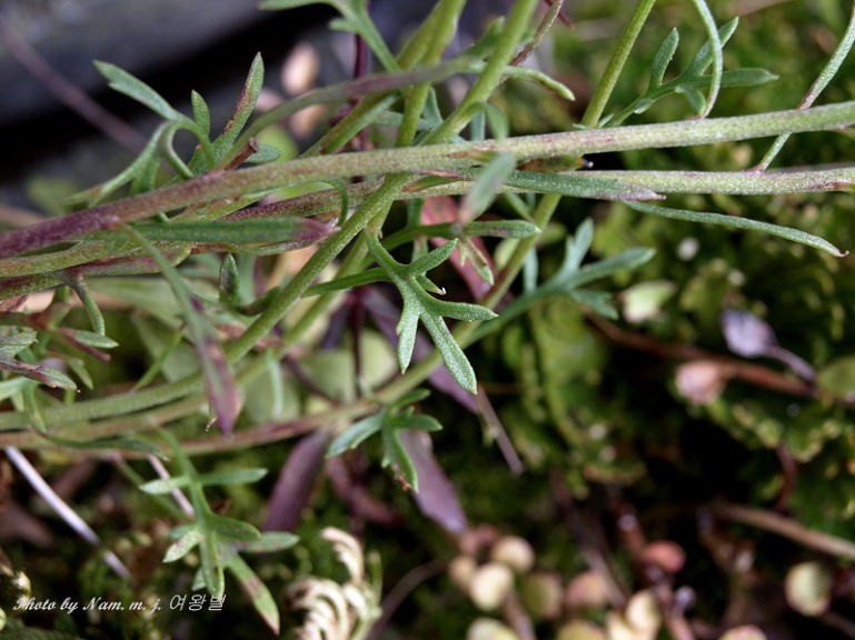 근생엽과 밑 부분의 잎은 개화시 없어지며 우상으로 완전히 갈라지고 열편은 나비 2mm정도로서 끝이 뾰족하다.