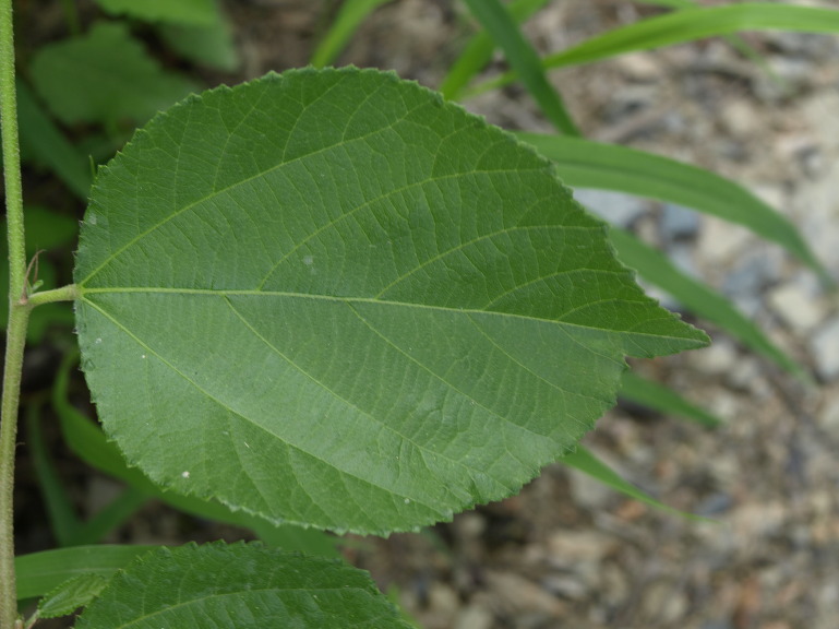 잎은 호생하며 난형 또는 능형 비슷한 난형이고 , 아심장저 또는 넓은 예저이고 기부에서 3개의 큰 맥이 발달하고 있다.