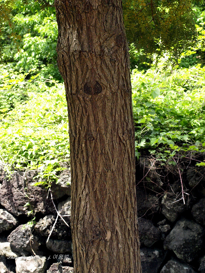 높이 25m, 지름 2m에 달한다. 수피는 회갈색이며 줄기가 사방으로 퍼지고 노목의 것은 얕게 갈라져 떨어진다