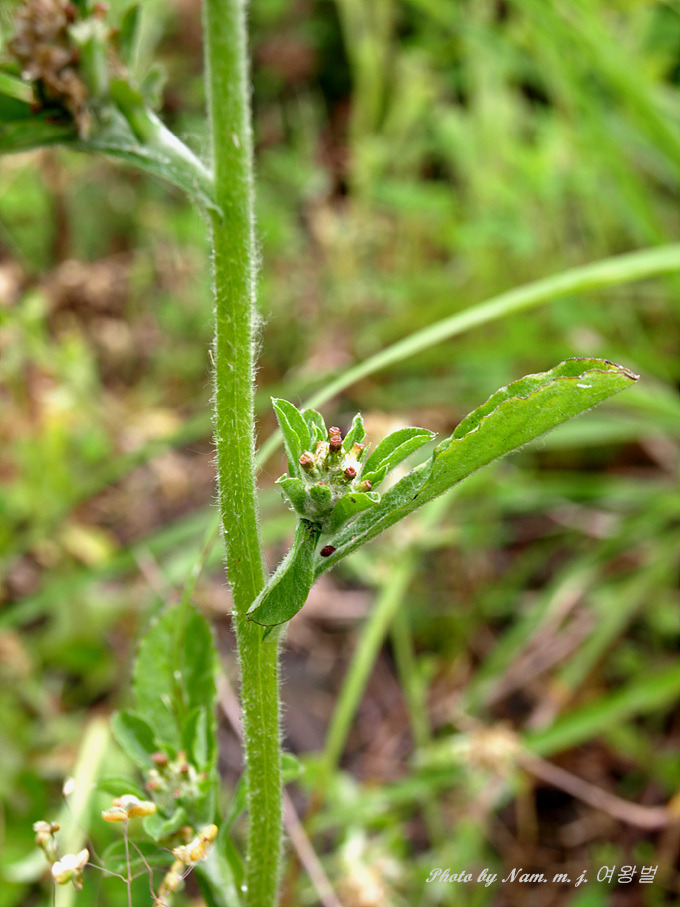 뿌리잎이 개화기에 시들고, 줄기와 잎 뒷면의 백색털이 적은 점이 특징이다.
