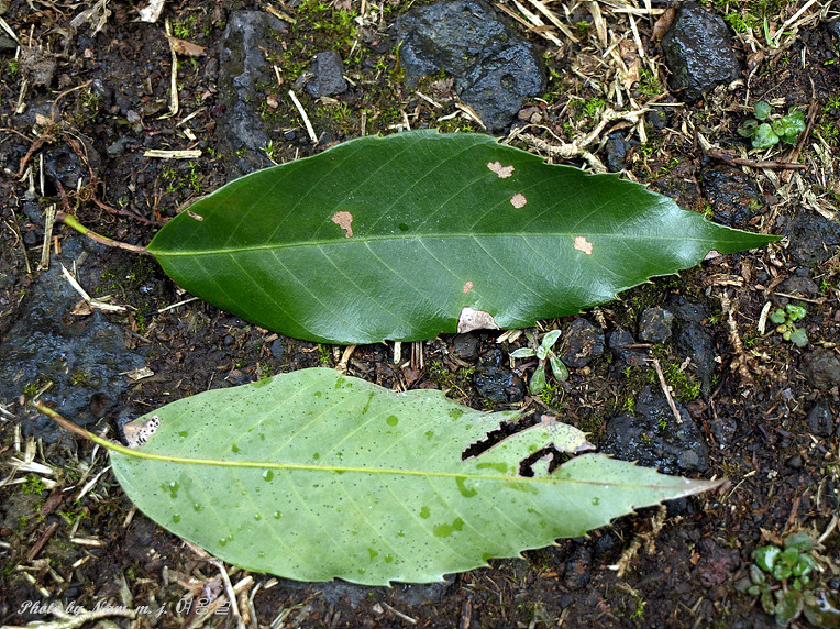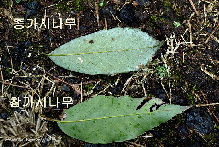 상반부 안으로 굽은 톱니, 뒷면 회백색 | 상반부 날카로운 톱니,뒷면 황갈색 밀모 10-14쌍의 측맥 |