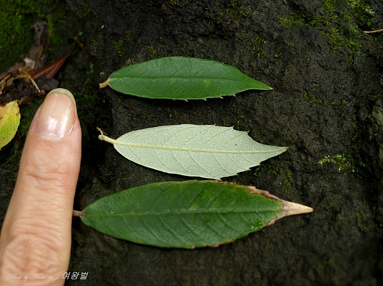 잎 뒷면은 털이 없고 회백색이며 맥이 크게 드러나지는 않았다. 측맥이 11~15쌍이다