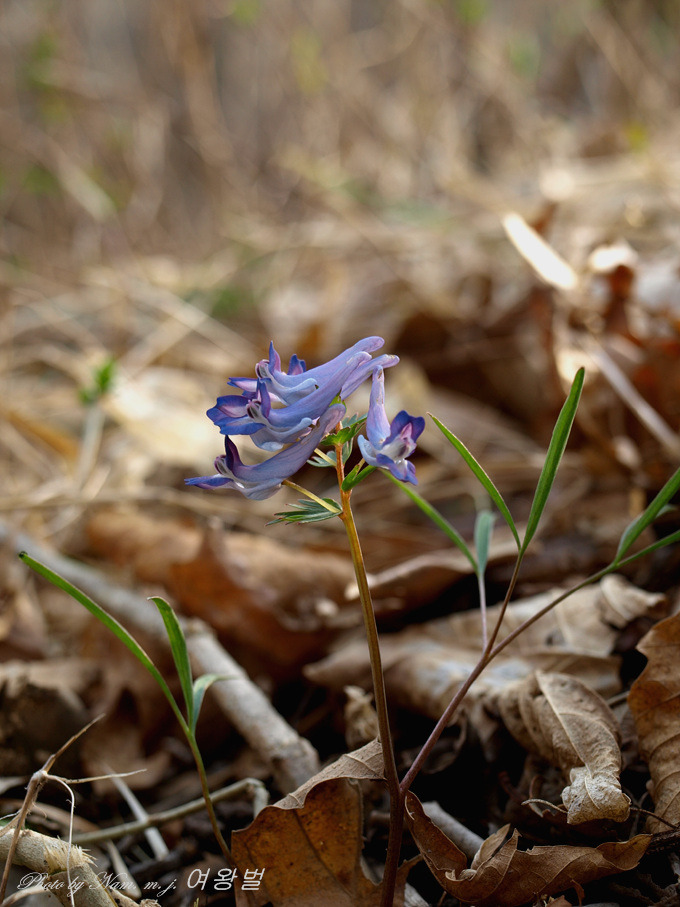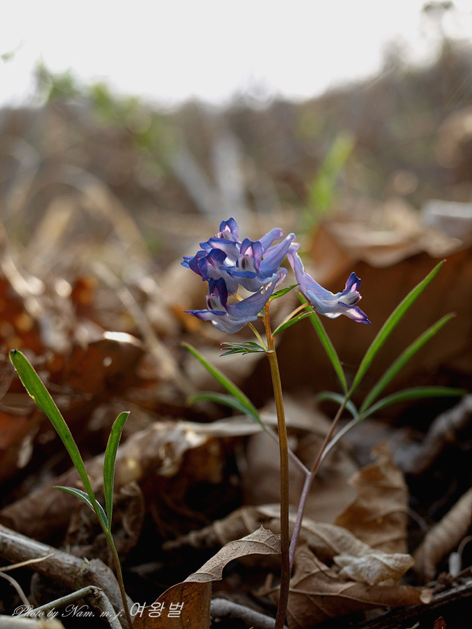 십여 분을 걸어 들어간 골짝에는 넘어가는 햇살 받으면서 날개현호색이 옅은 보라색과 푸른 기운이 도는 색으로 꽃을 피우고 있었다.