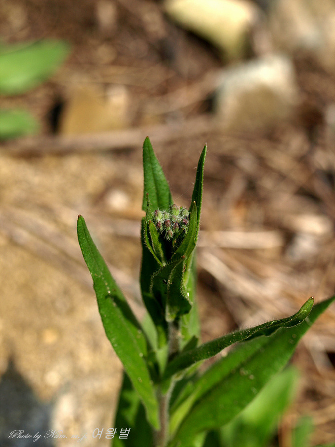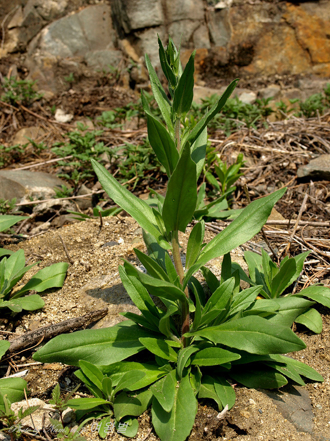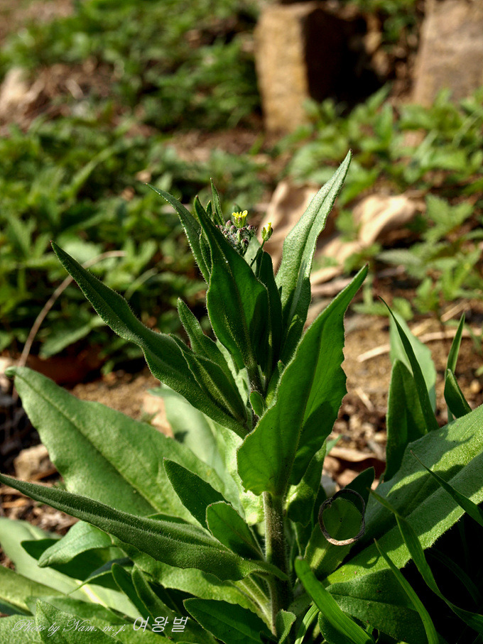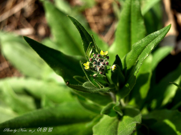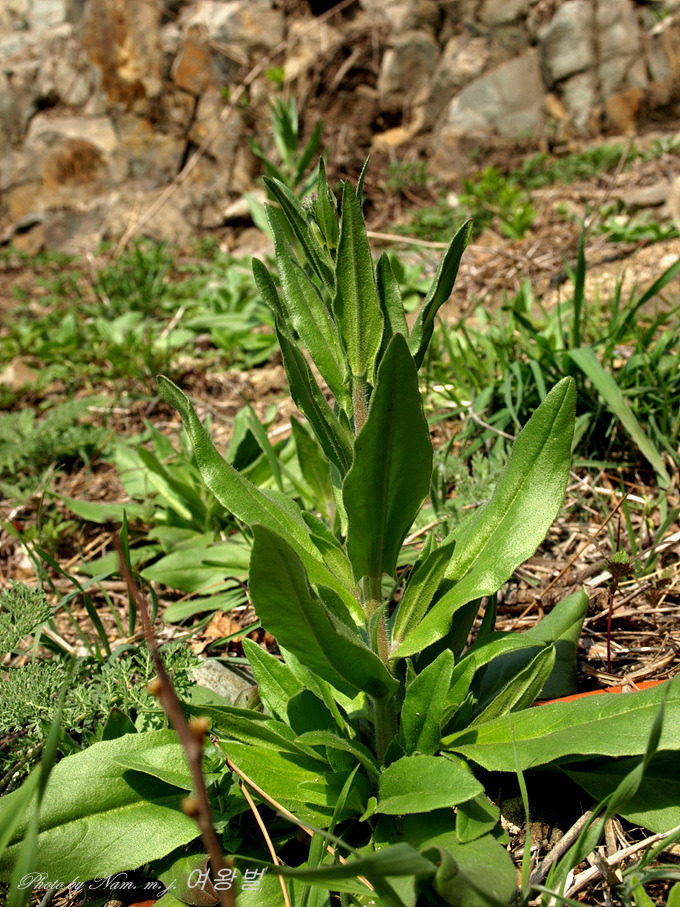 역시 털이 많고 꽃은 노란색으로 잎은 호생하며 피침형으로서 엽병이 없고 중앙부의 잎은 길이 5cm , 폭 1cm이지만