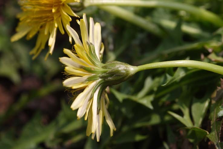 서양민들레, 붉은씨서양민들레 : 외총포가 아래로 젖혀지고 돌기가 없다 |