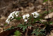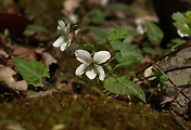 잎은 뿌리에서 나오고 길이와 폭이 각 2.5-5cm로서 난형, 넓은 타원형 또는 심원형이며 둔두 또는 원두이고 심장저이며 양면에 털이 약간 있고 가장자리에 둔한 톱니가 있다. 표면은 짙은 녹색이지만 엽맥을 따라 백색무늬가 있고 뒷면은 자주색이다. 엽병은 길이 2-5cm이지만 긴 것은 길이 15cm이상인 것도 있다.