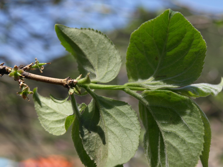 잎이 넓은 난형으로 넓고 잎자루와 뒷면에 털이 많다.
