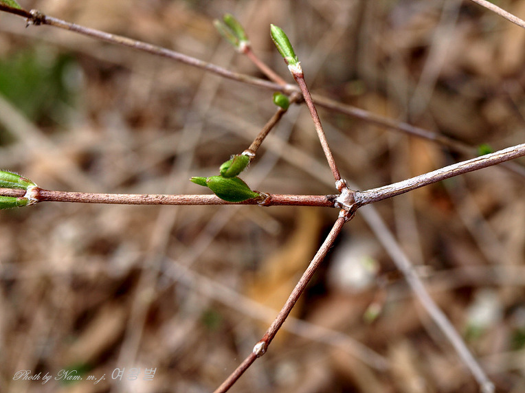 소지는 붉은색이 돌고 잎은 마주나기로 잔가지가 마주나 있다. (2011. 4. 24. 영월.)
