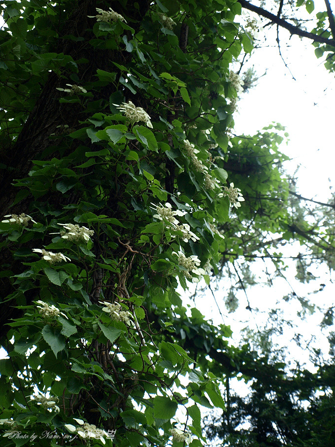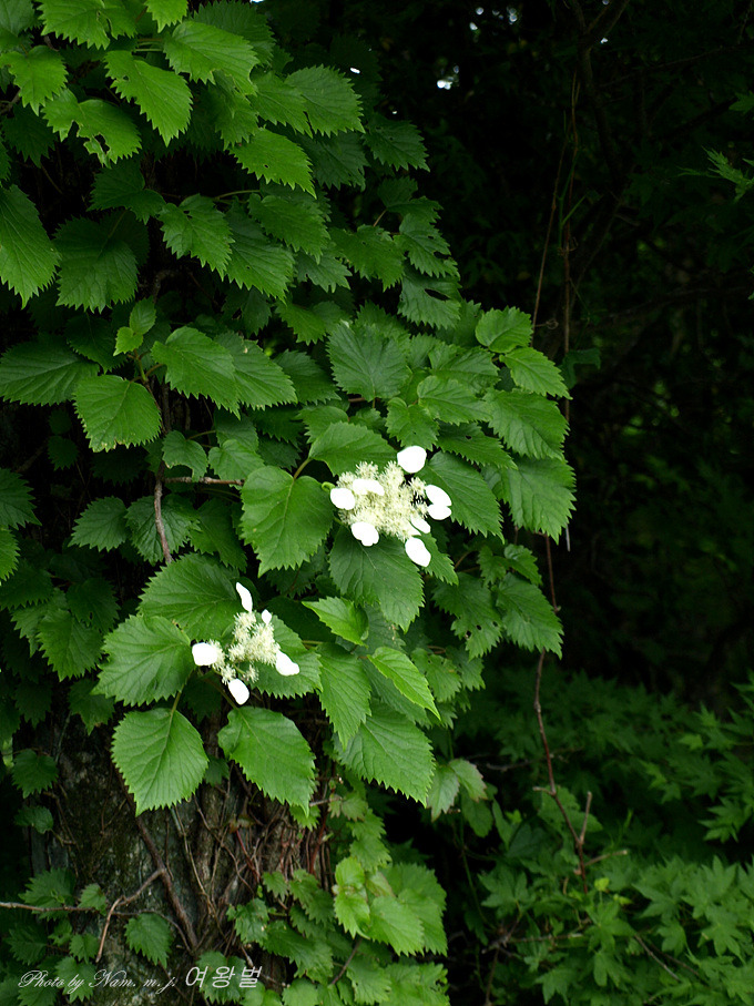 등수국과 함께 덩굴성 수국인 이 녀석은 등수국보다 잎의 결각이 크고 , 장식용 중성화 꽃잎이 1장으로 이루어진 점이 다르다.
