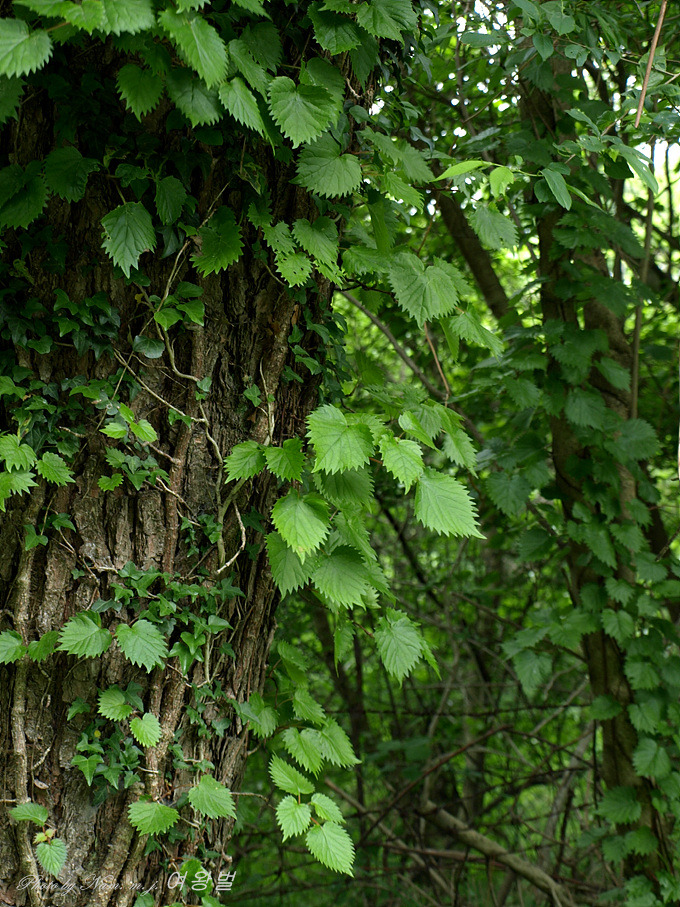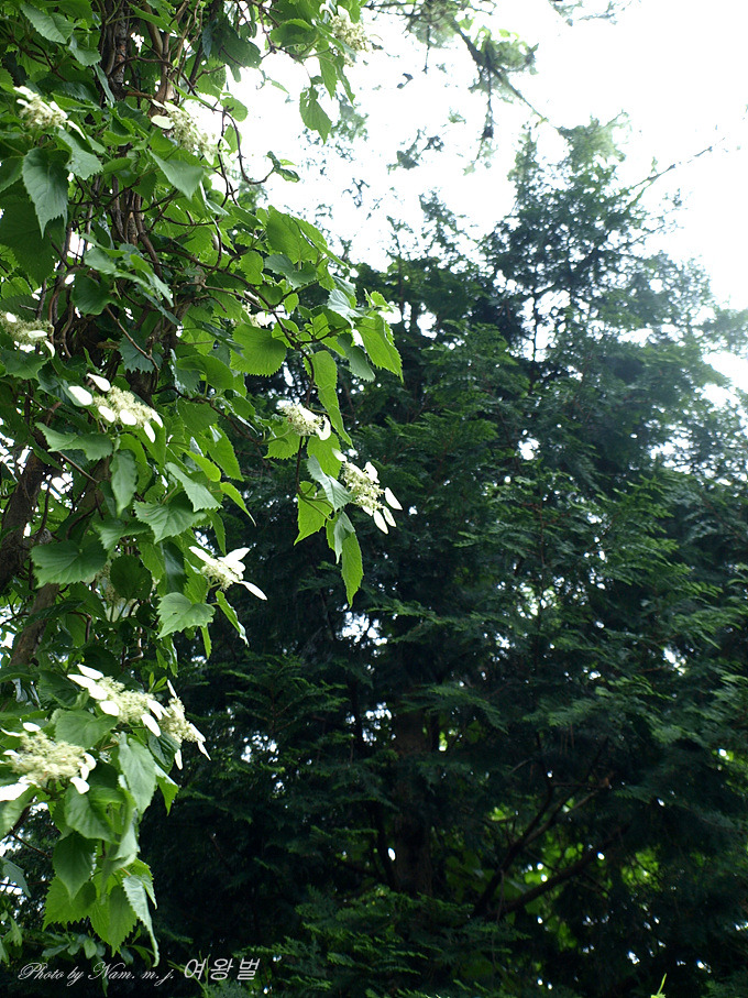 원시의 숲 나무 등걸을 타고 오르는 바위수국은 하얀 신부 부케 꽃다발로 여름의 한라산을 즐겁게 하고 있다.