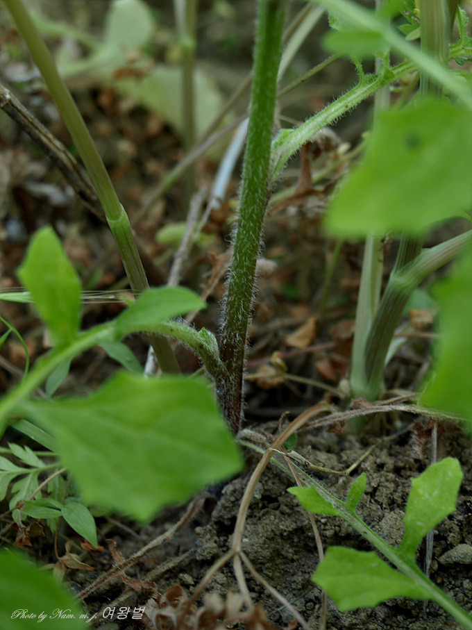 우리나라 남부의 들이나 밭에 나는 2년초. 키가 5-20cm. 전체에 털이 있음. 근생엽은 밀생하며 땅위로 퍼진다.