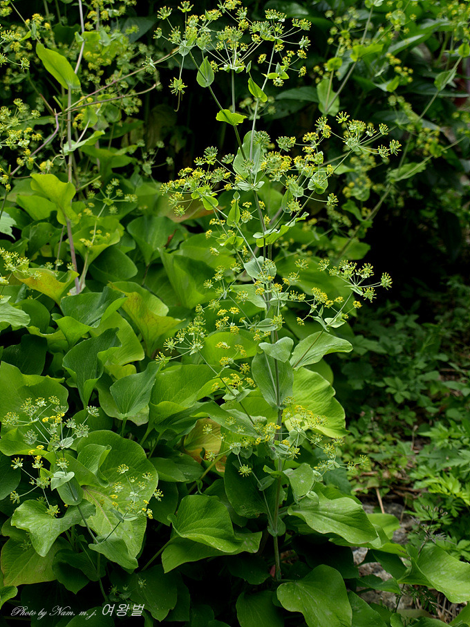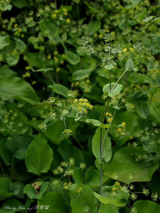 꽃은 황색으로 줄기나 가지끝에 겹산형화서로 달린다. 포엽과 소포엽은 각 5개이고 끝이 뾰족하며 밑부분이 심장저이고 소화경과 자방에 털이 없다. 꽃받침은 거의 없으며 꽃잎은 도란형이고 황색으로서 안쪽으로 굽으며 끝이 뾰족하고 5개의 수술은 꽃잎과 호생하며 꽃밥은 난형이고 황색이다
