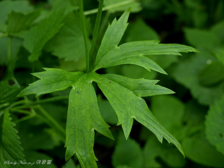 경생엽은 약 2개이며, 짧은 엽병과 함께 3개로 갈라져 있고 열편은 깊은 치아상의 거치가 있다.