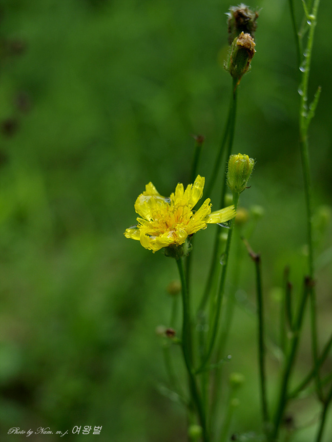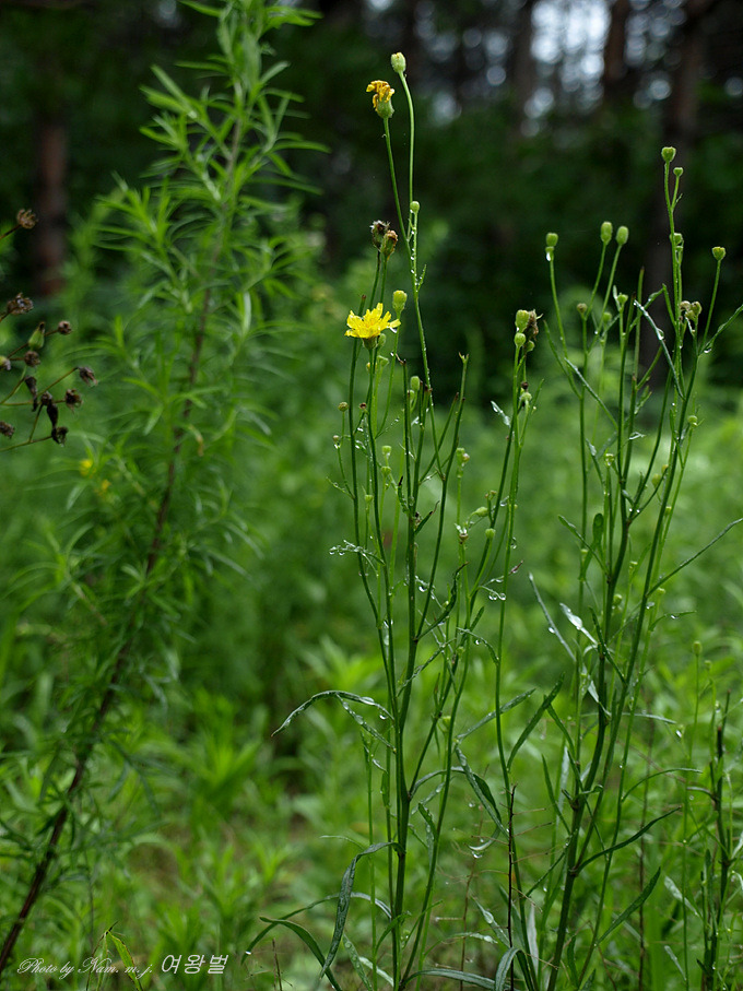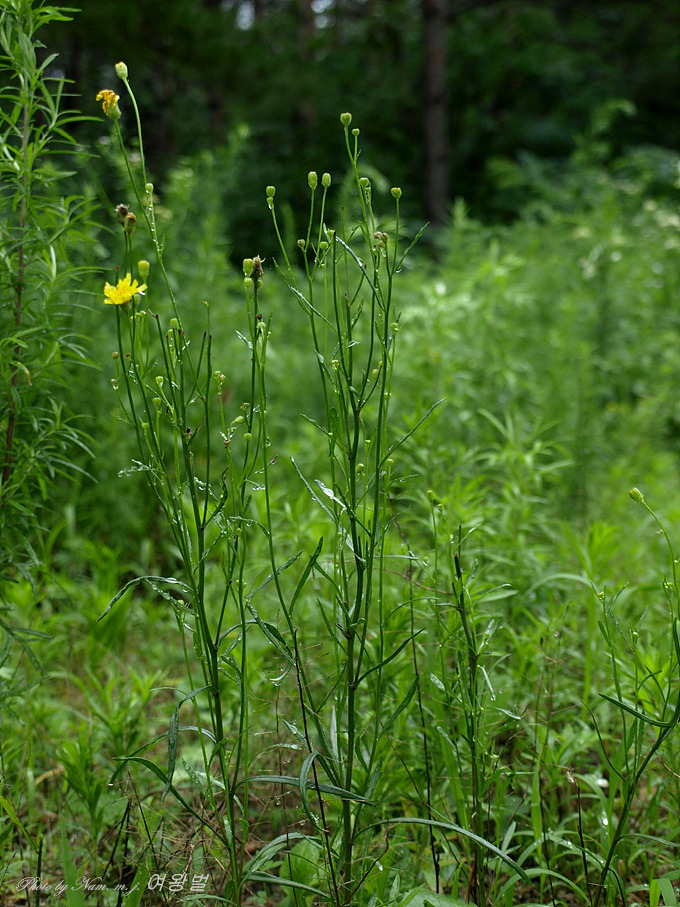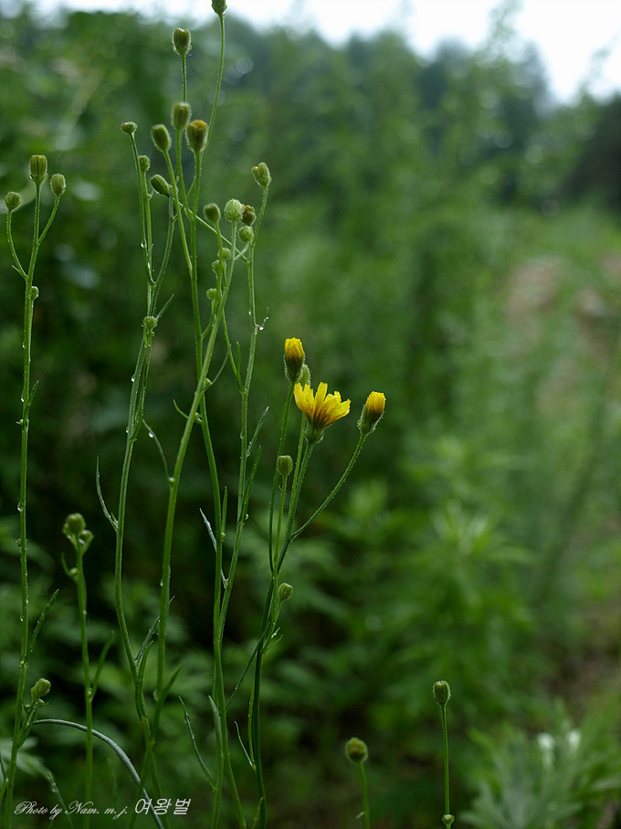 꽃은 5-7월이 피며 노란색이고, 줄기 위쪽이 여러 갈래로 갈라져 그 끝에 달리며, 두상화서는 지름이 2cm정도이고 설상화로만 이루어졌으며, 총포는 길이 6-9mm이고 내편은 12-15개로 털이 많고, 외편은 길이가 내편의 1/3-1/2이며 털이 많다. 줄기에는 백색 털이 있다.
