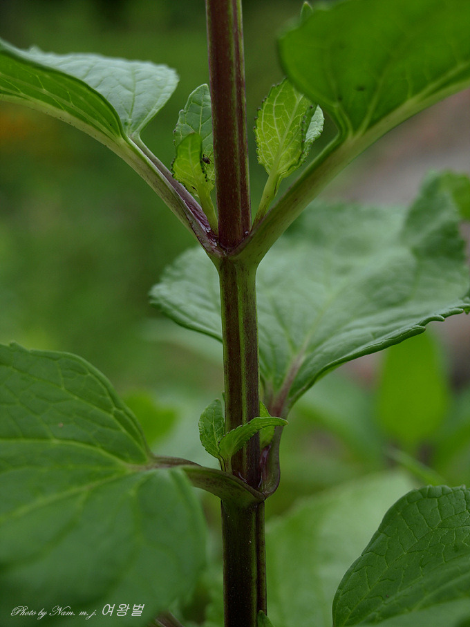 줄기는 4면으로 이루어져 있는데 납작한 면과 패인 면이 서로 마주하고 있고 이것도 마디마다 지그재그로 어긋나게 되어 있다. 패인 면은 돌출한 2개의 능선이 있는데 아마 줄기에 날개가 있다는 게 바로 이를 두고 지칭하는 것 같다.