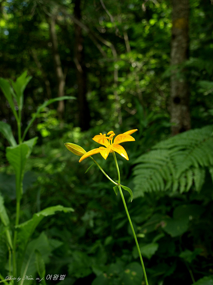 초록의 숲에서 햇살 받은 하늘 말나리가 아름다운 자태를 자랑하고 있다.
