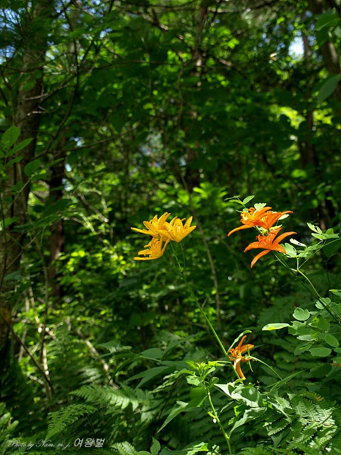 앞서 가던 꽃동무의 탄성소리에 잰 걸음으로 달려 가니 히야~~! 참말로 누른말나리가 하늘말나리와 어울려 절정을 이루고 있다.