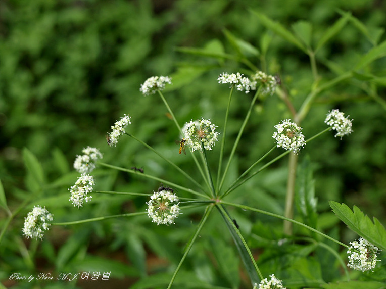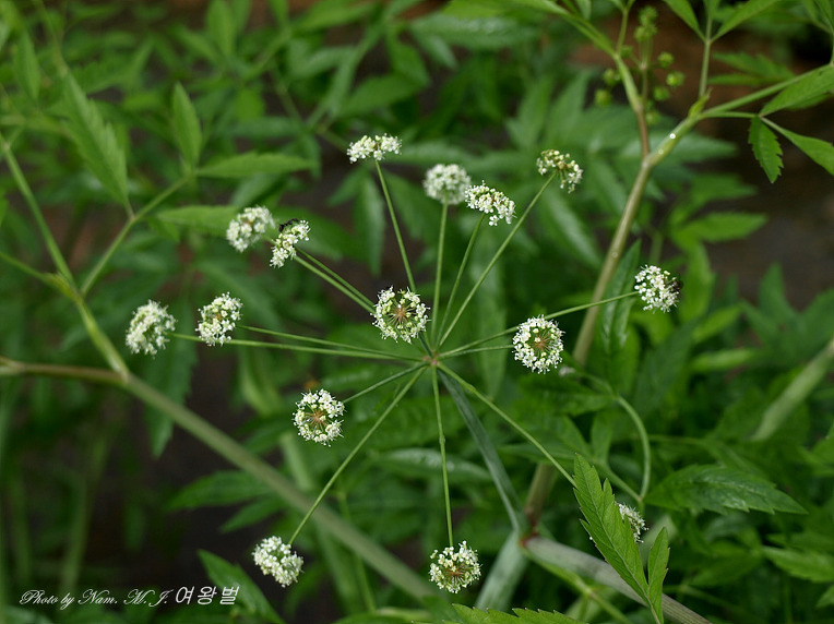 꽃은 하얀색이며 6~8월에 줄기 끝에 산형꽃차례로 핀다. 꽃잎은 5장이며 열매는 동그랗게 익는다.