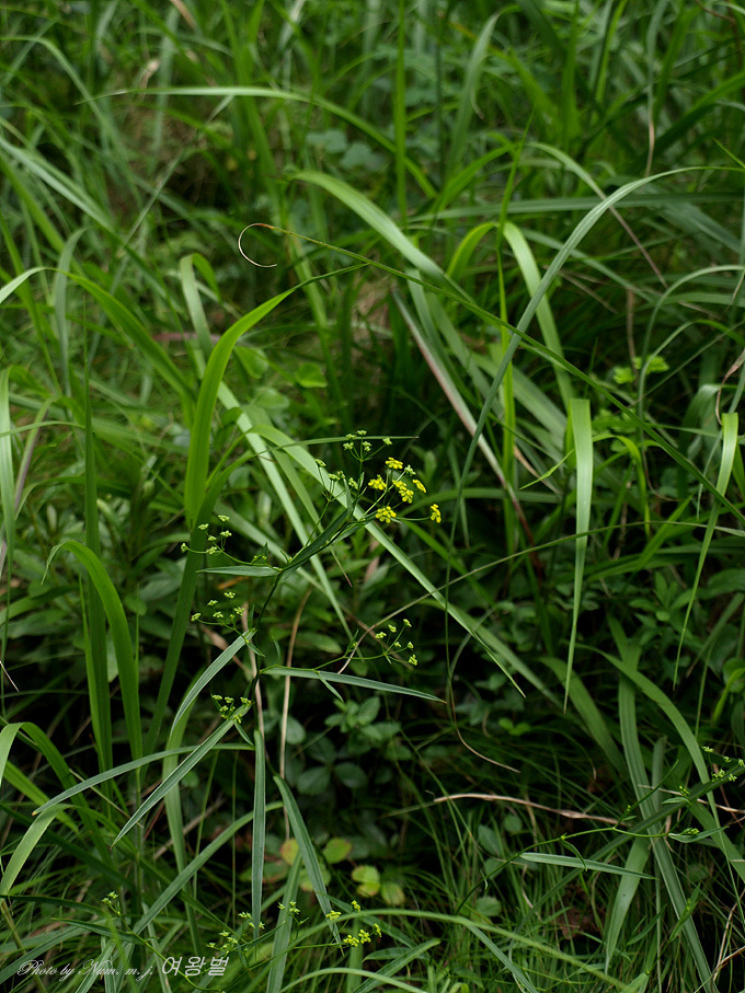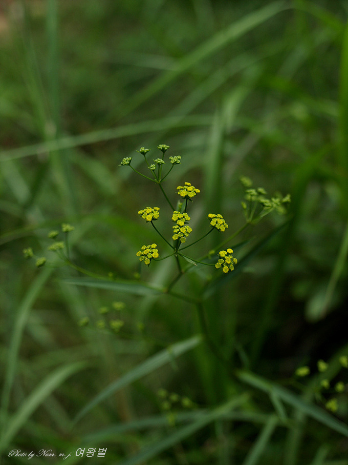 꽃은 8~9월에 피며 황색이고 원줄기 끝과 가지 끝의 복산형화서에 많이 달리며 소산경은 2-7개이고