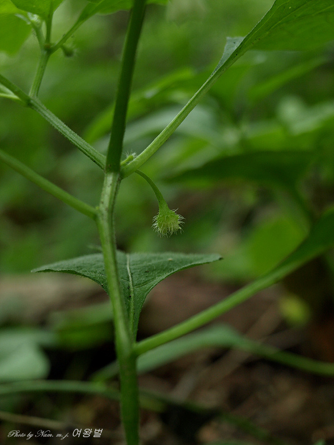 꽃은 6-8월에 피며 연한 황색이지만 중심부는 녹색이고 엽액에 1-3송이씩 밑을 향해 달리며 소화경은 길이 2-3cm로서 과시에는 끝부분이 굵어진다. 꽃받침은 잔 모양이고 가시털이 있으며 끝이 5개로 갈라지고 열편은 삼각형이며 화관은 겉에 짧은 털이 있고 수술은 5개, 암술은 1개 있으며 암술대에 털이 없다