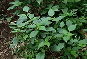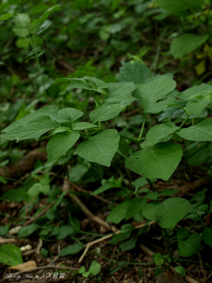 잎은 호생하지만 마디에서는 2장씩 달리며 엽병은 짧으며 난상 원형이고 길이 4-8cm, 나비 3-5cm로서