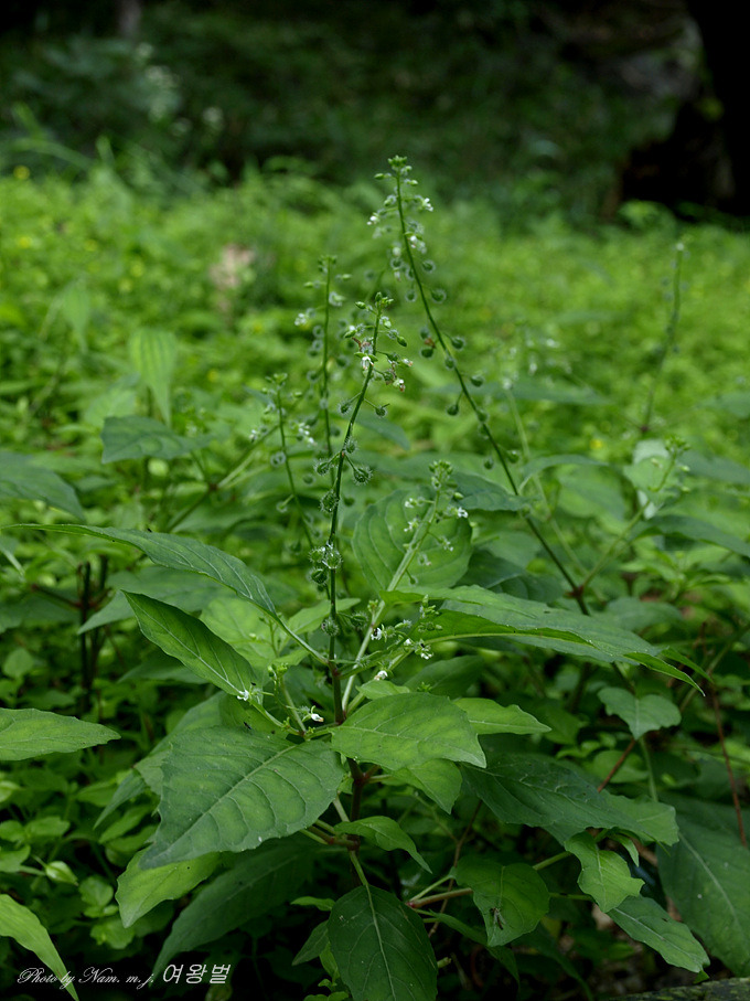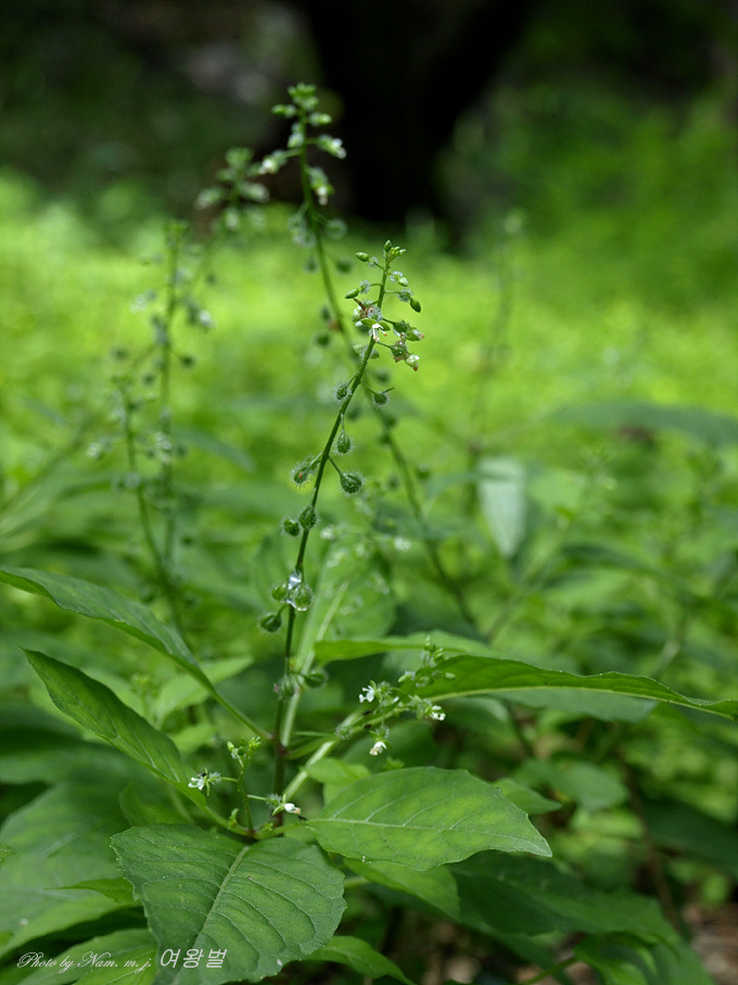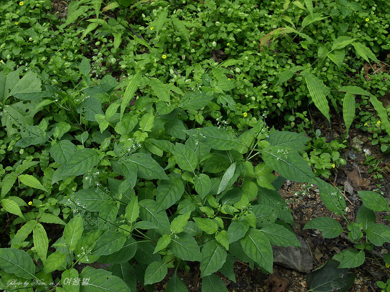 잎은 대생하고 마디 사이의 밑부분이 다소 굵으며 홍자색이 돌고