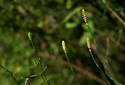난형의 비늘잎이 대생으로 나 있는 줄기 끝에 사각을 이루는 포자낭 이삭이 발달하고