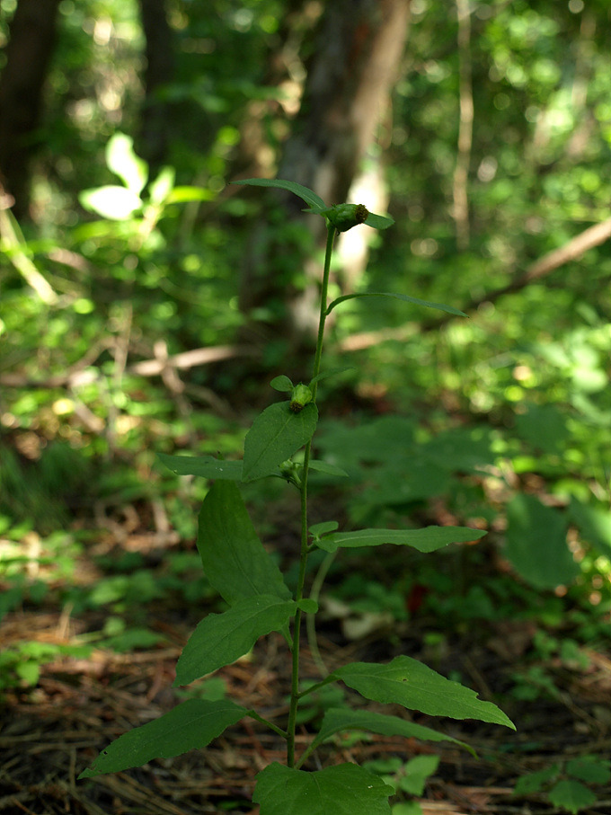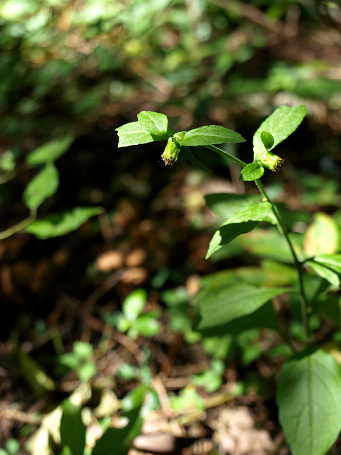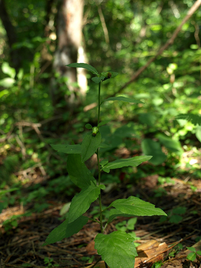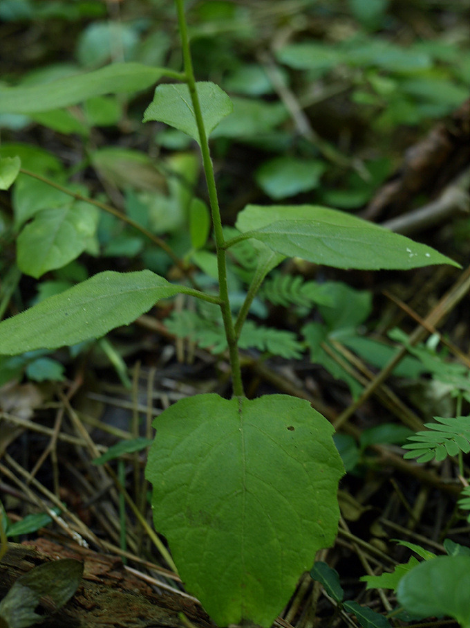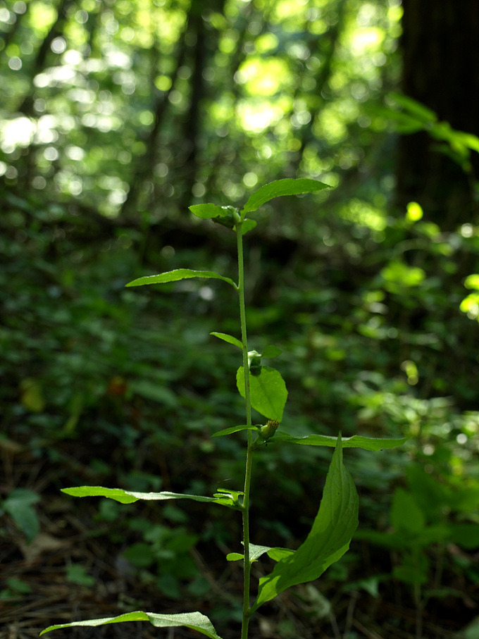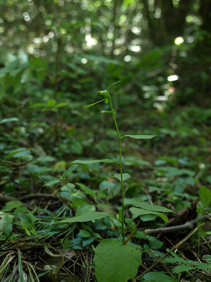 빛이 충분하지 않은 숲 그늘이라서 전초가 충실하게 크지 못하고 화서도 빈약하지만 잎 겨드랑이에서 돋은 꽃의 화경이 있다.