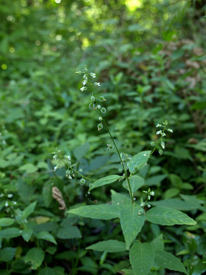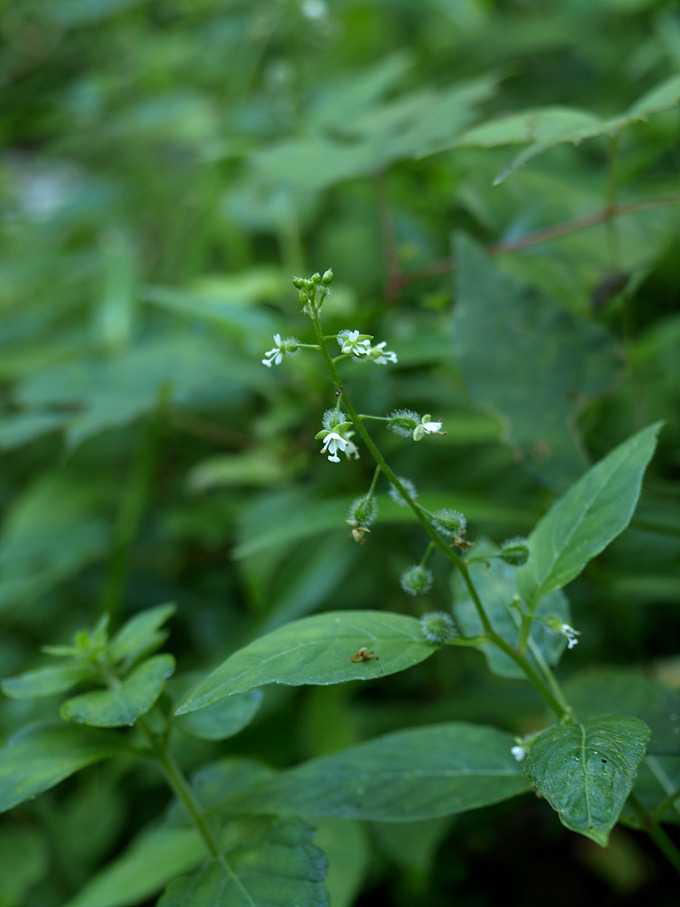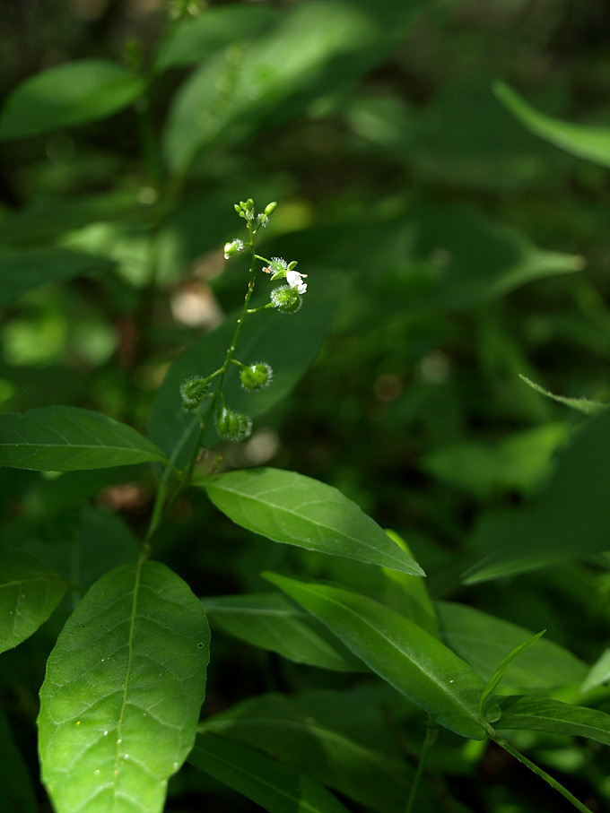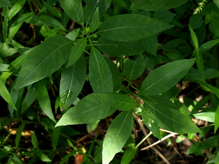 잎은 대생하고 마디사이의 밑부분이 다소 굵으며 홍자색이 돌고 넓은 피침형이며 밑부분이 예저 또는 원저이다.
