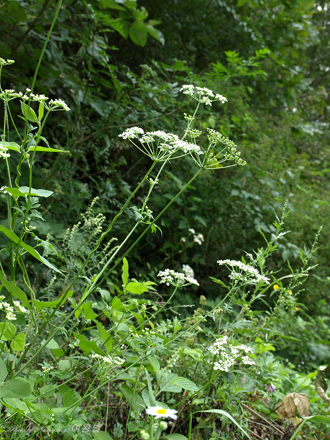 잎이 미나리를 닮앗는데 향은 참나물 향이 나고 키가 1m나 되는 산형과다.
