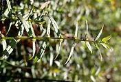 아래잎 : 길이 4-8cm, 폭 5-15mm 가장자리에 뾰족한 톱니가 있다. 위쪽 잎 : 길이1.5-3cm, 폭1.5-5mm 톱니가 없는 것도 있으며 양끝이 좁다. |