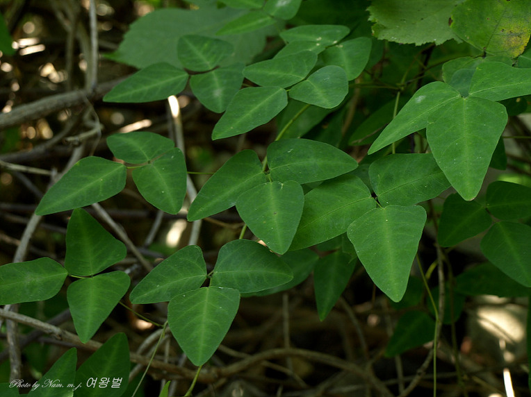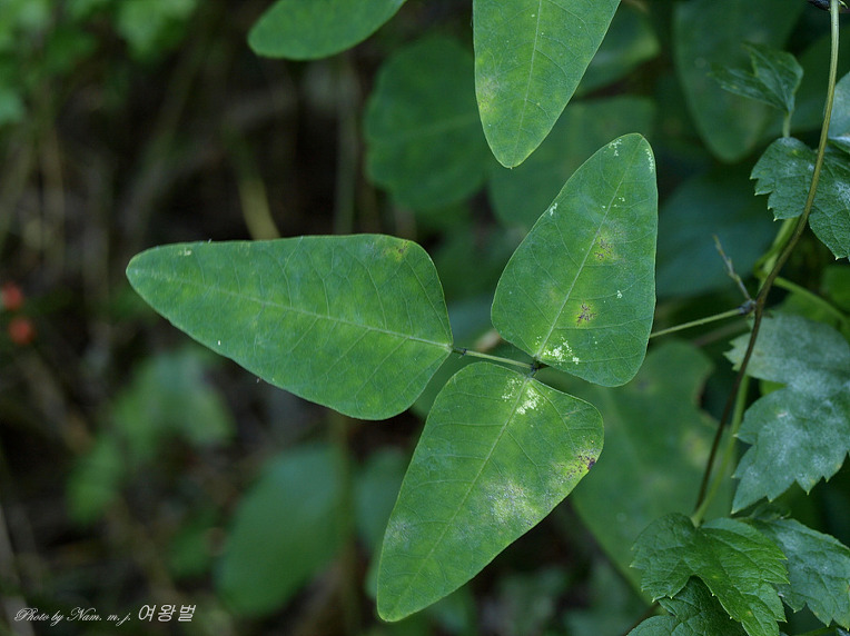 잎은 호생하며 3출엽으로서 엽병이 길고 소엽은 긴 난형이며 위로 갈수록 점차 좁아지고 둔한 끝에 소돌기가 있으며