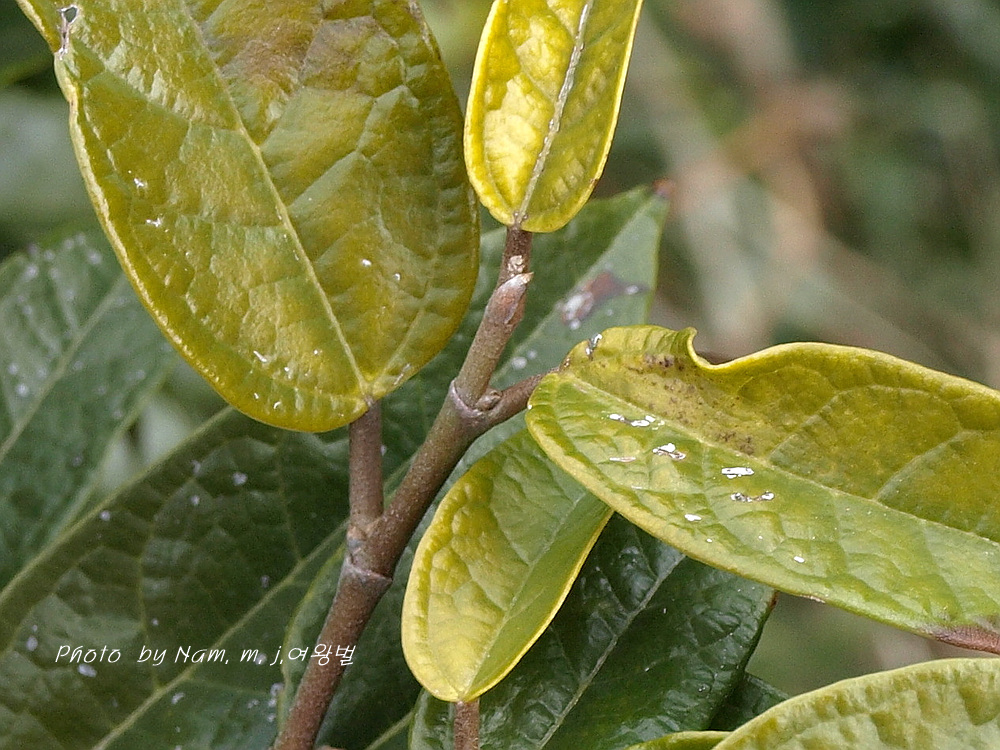 잎은 혁질로 표면에 광택이 있고 길쭉한 타원상 피침형으로 끝이 뾰족하며 엽저는 얕은 아심장형이다.