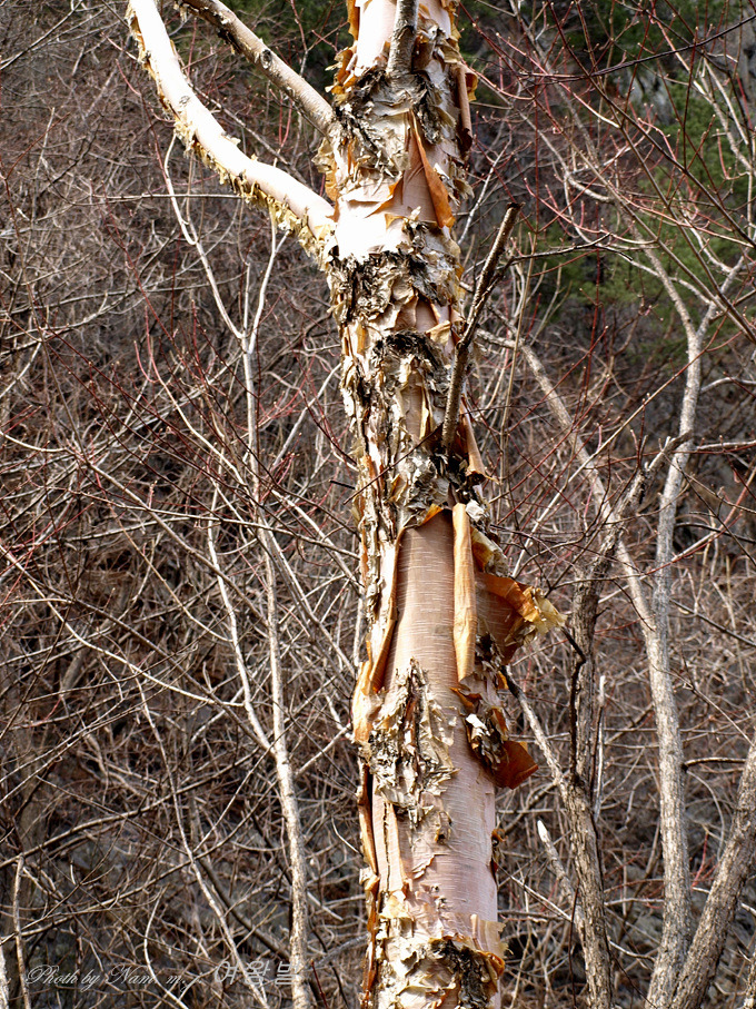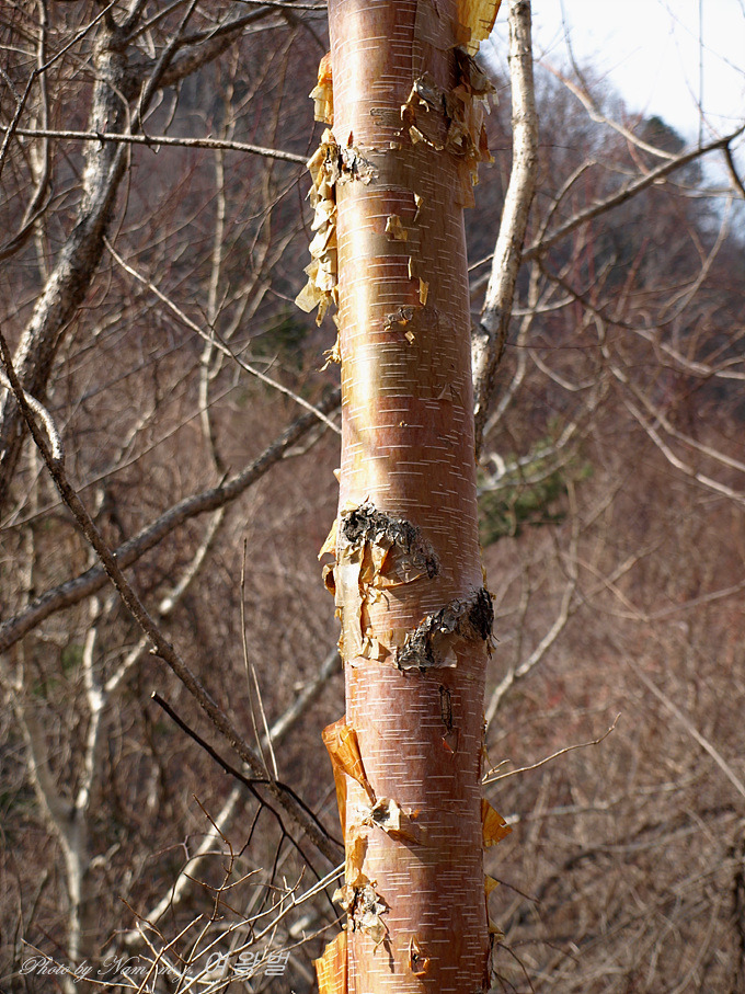 겨울 강원도 높은 산에서 종잇장처럼 얇은 수피를 벗기고 있는 모습을 볼 수 있는 녀석이다.