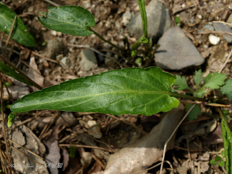 잎자루에 날개가 없고 긴 삼각형 모양의 잎과 꽃잎 아래 순판에만 자색 줄무늬가 있는 녀석이다.