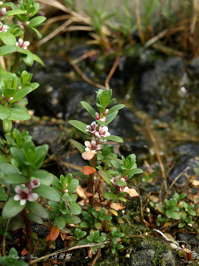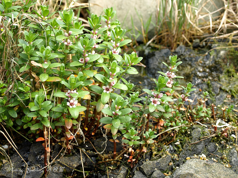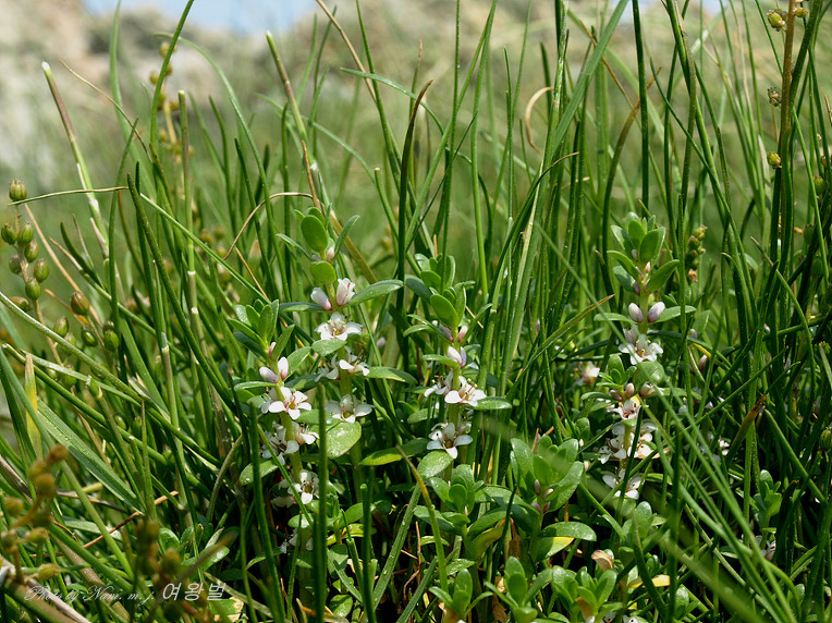지채와 함께 어울려 사는 갯봄맞이는 바닷물이 들락거리는 물통이에 서식을 한다.