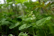 꽃은 원줄기 끝에 달리며 윗부분에서 5개의 잎이 윤생하고 5개의 가지가 산형으로 갈라진다.