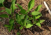 잎은 난형 또는 넓은 난형이며 끝이 약간 둔하고 길이 2.5-4cm, 나비 1.5-2.5cm로서 예저 또는