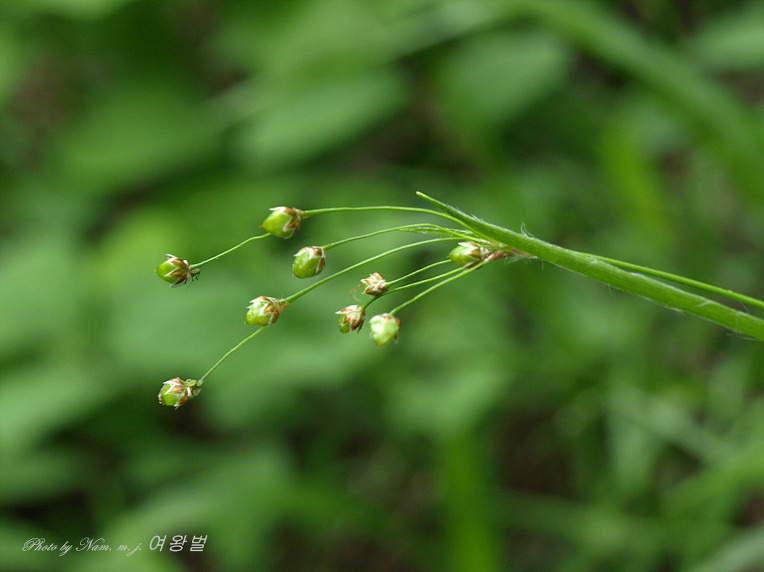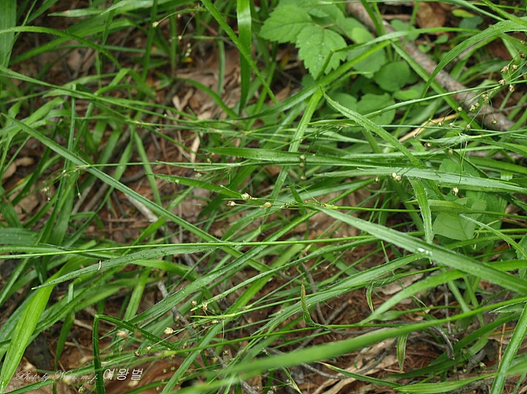 | 다년초로 수염뿌리를 가지며 지하경이 길게 발달하고 1 〜여러대가 모여나며 길이는 18-(28.8)- 38cm로서, 화서축이 옆으로 눕는다. 잎은 선형이고 선단부는 갑자기 좁아지며 경엽은 2~3개가 어긋난다. 꽃은 5-(8)-11 개의 소화서축으로 나뉘어지고, 다시 2 ~ 4 개의 소화서축으로 나뉘어 취산화서를 이루며 끝에 1 개의 꽃이 달린다. 열매는 3개의 능선을 가진 도란형의 삭과이며, 길이는 4.8mm 내외로서 화피보다 길고 연한 담황색〜掲色이며 광택이 나고 3개의 종자가 들어 있다. |