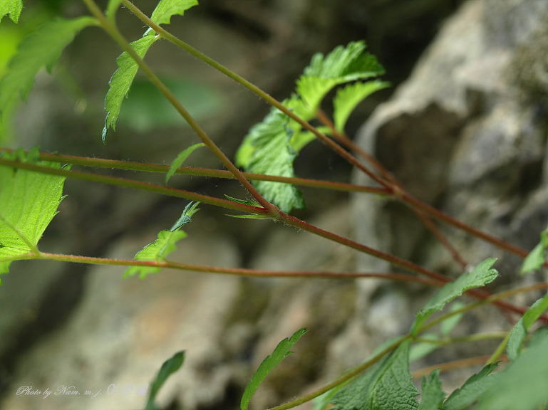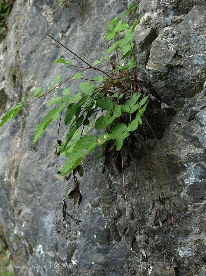 석회암 벽에 붙어 자라는 다년초 높이는 20∼30cm이고, 홍자색 또는 홍갈색을 띠고 전체에 누운털이 있다