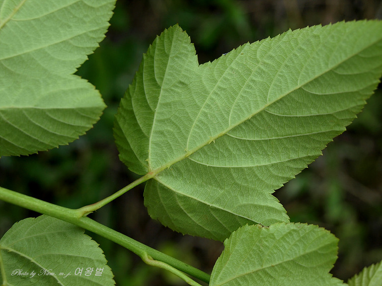 잎 밑부분이 3개로 갈라지는 것도 있는데, 특히 맹아에 있어서 그러하고 엽병은 길이 15-20mm이다.