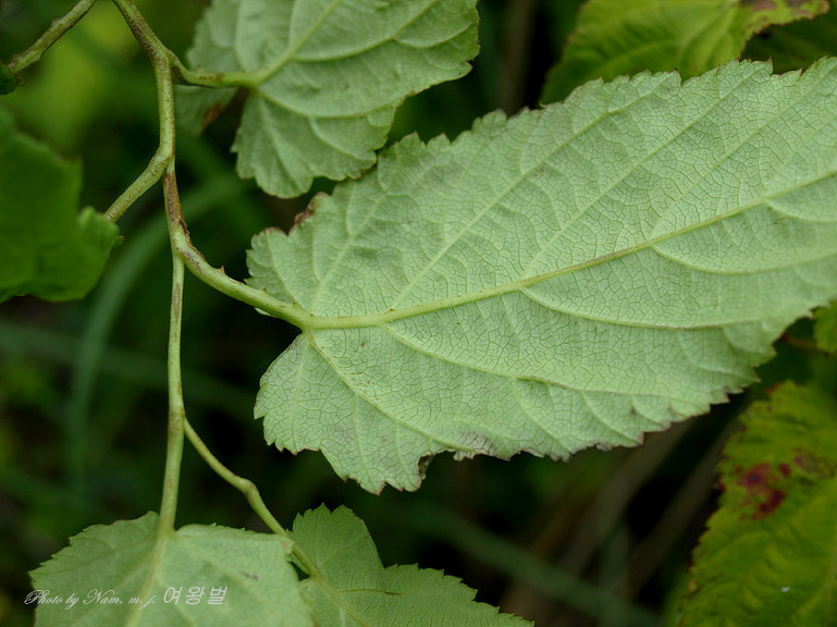 가장자리에 불규칙한 잔톱니가 있으며 잎 뒷면 맥 위에만 털이 약간 있다.