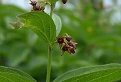 줄기 아래쪽 잎겨드랑이에는 열매가 맺혀 있고 줄기 위쪽에 수꽃 꽃술이 보인다.