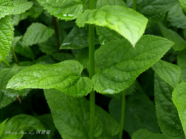잎은 대생하고 엽병이 짧으며 난상 피침형이고 예두 원저이며 길이 10~15cm, 폭 4~7cm로서 가장자리에 잘고 뾰족한 톱니가 있다.