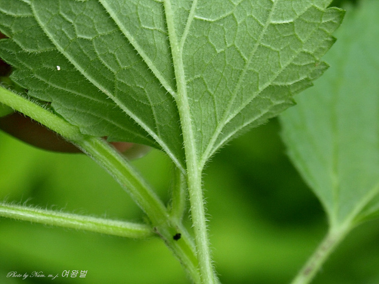 잎 뒷면과 잎자루에도 아래로 향한 잔털이 많다.