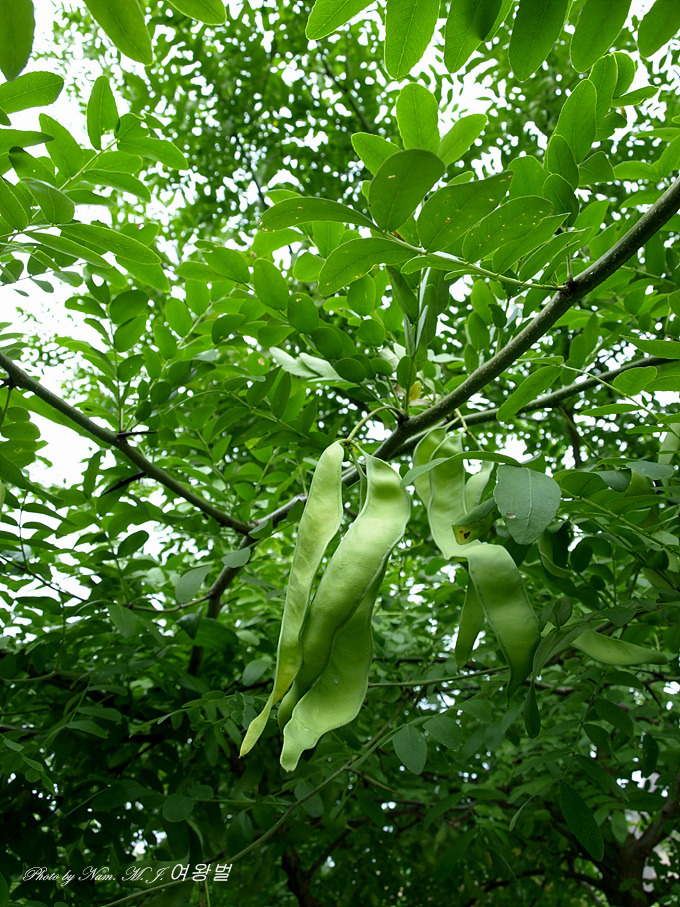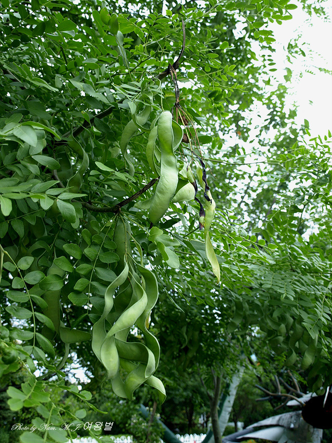열매는 길이 23㎝, 넓이 3㎝의 납작한 협과로 꼬투리는 비틀려서 꼬이며 10월에 성숙한다. 열매의 내피속은 잼같으며 달콤하다.