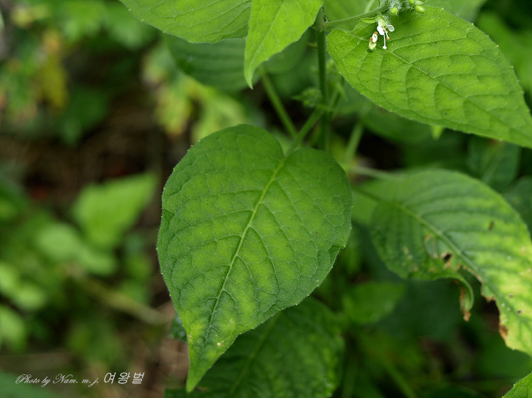 | 삼각상 심장형 또는 난형 얕은 심장저이거나 심장저 비슷 예두,표면과 가장자리에 잔털 길이 1-2.5cm, 폭 7-20mm로서 뾰족한 톱니가 약간 있으며 엽병은 1-2cm 날개 있고 붉은빛 |
